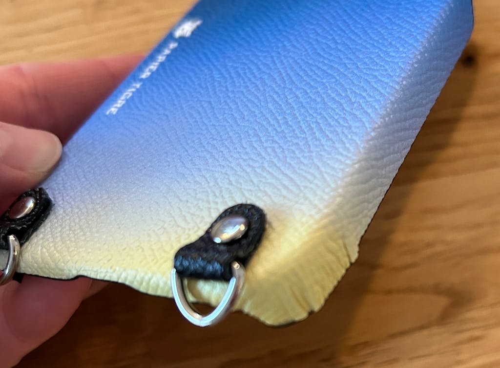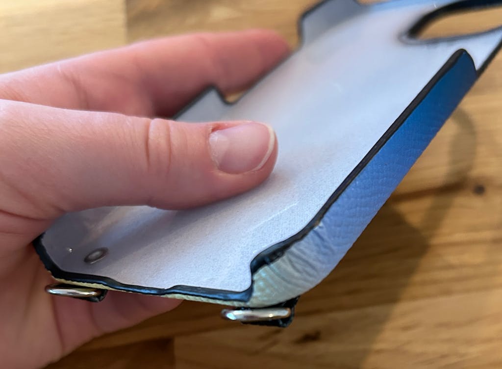 独自技術により、ケースの背面から側面まで一枚のレザーで覆うように仕上げています。