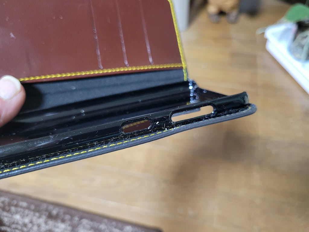 裏のカメラホールは、機種にあわせて開いていますので、手帳カバーを装着したままカメラ撮影ができます。