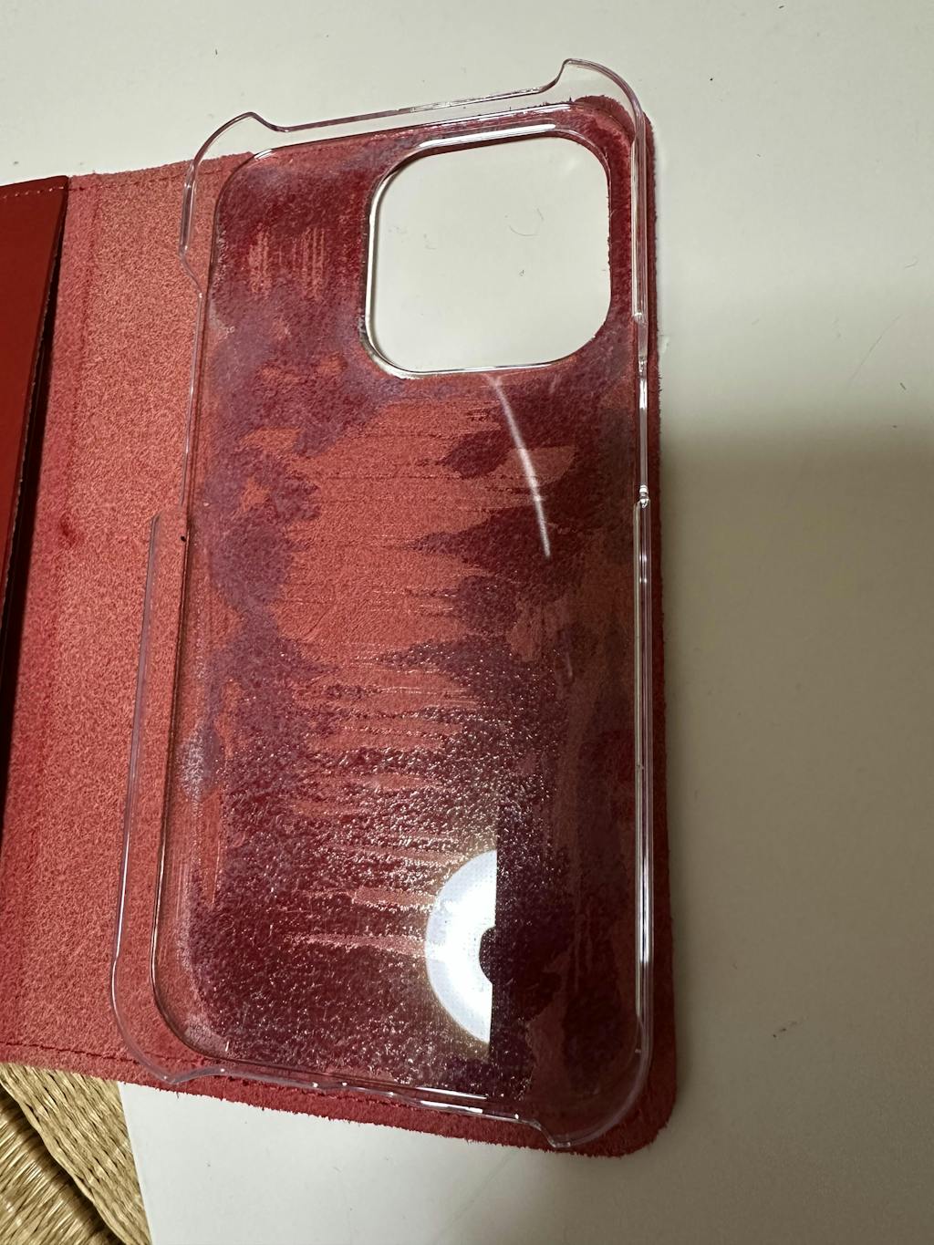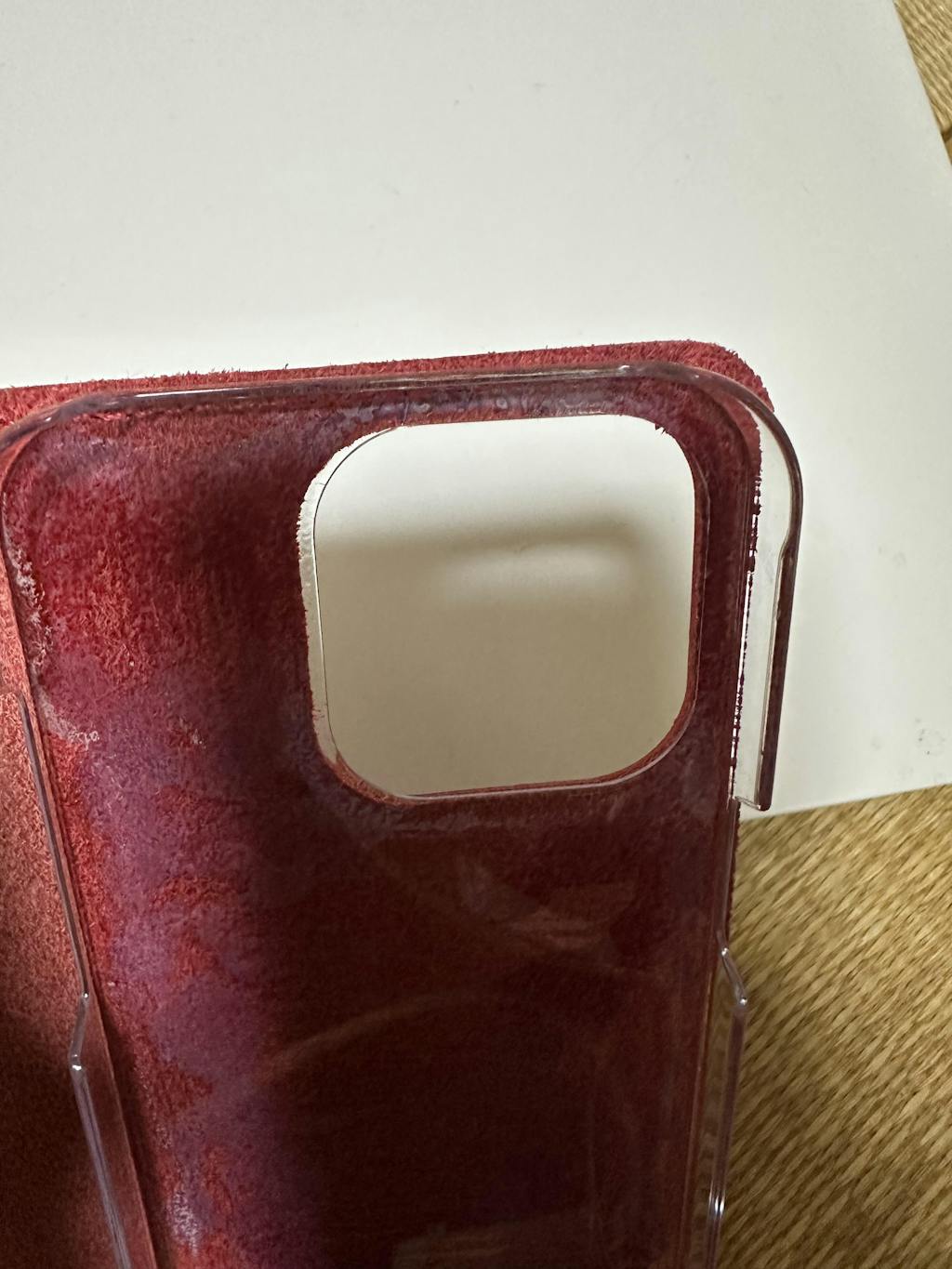 裏のカメラホールは、機種にあわせて開いていますので、手帳カバーを装着したままカメラ撮影ができます。