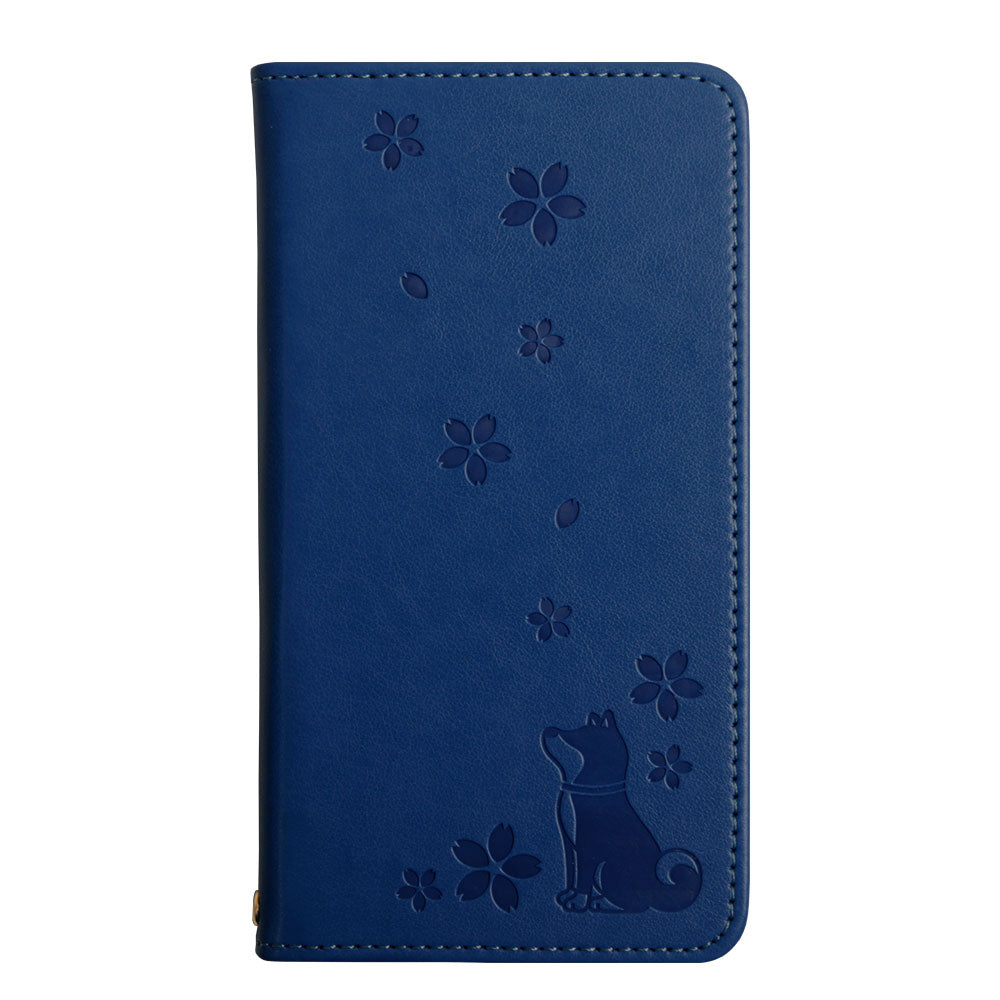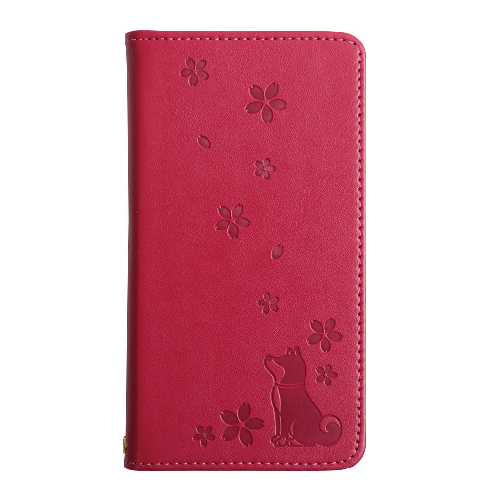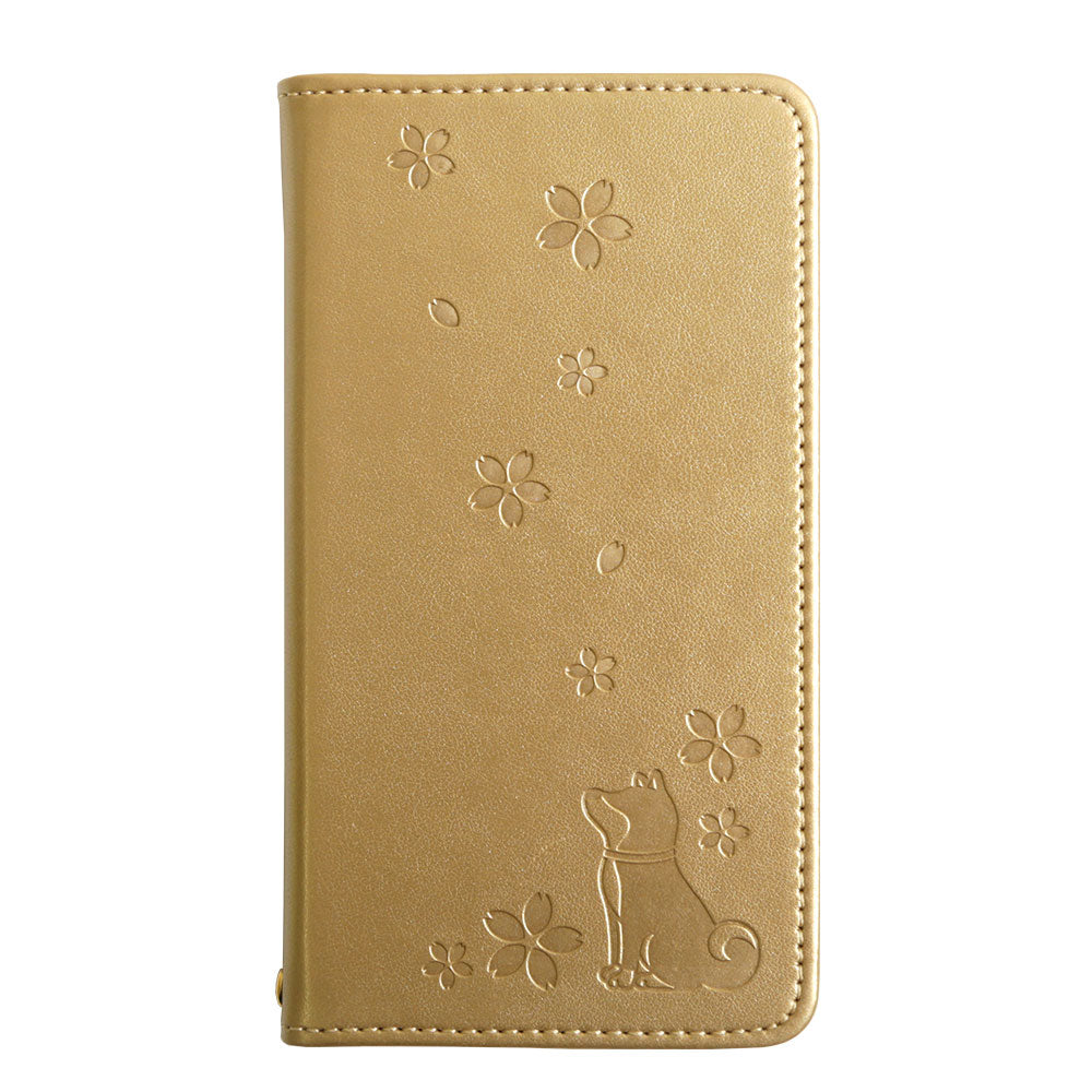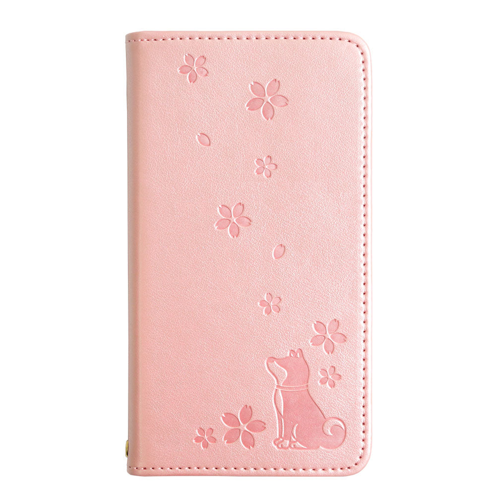 桜の花びらが舞う中で、お花見しながら散歩しているワンコをデザインしたキュートなスマホケース。可愛い柴犬デザイン♪
