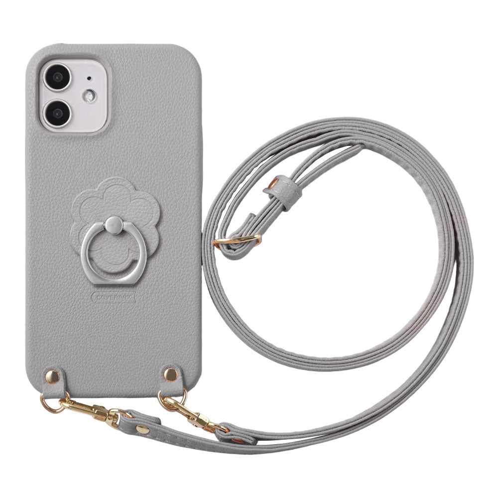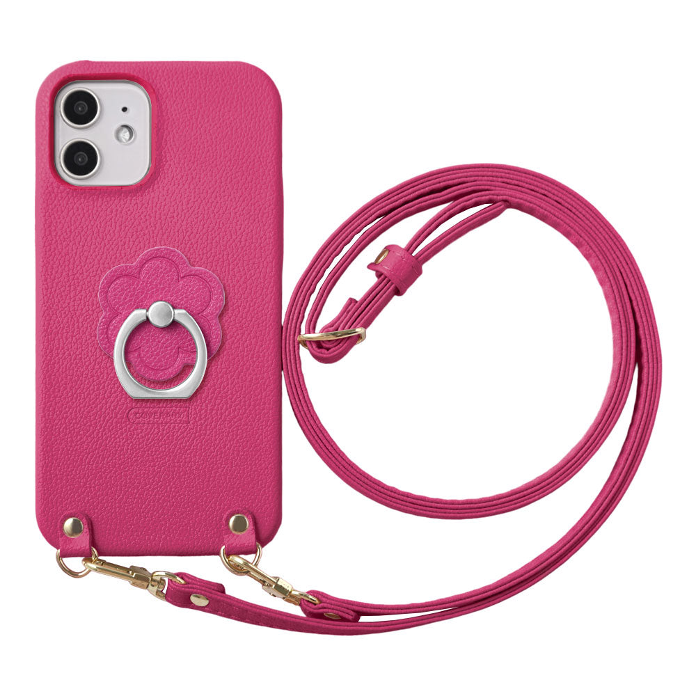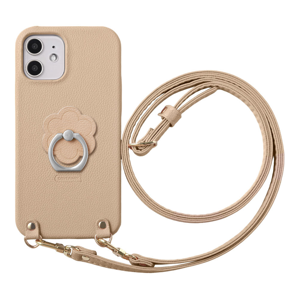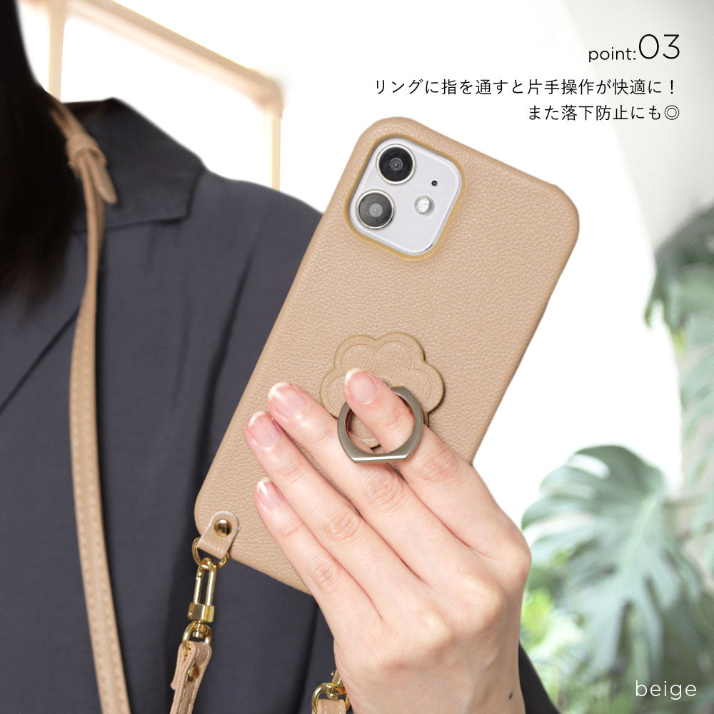ヴィーガンレザー ベーシック レザー調 フラワー スマホリング&ショルダーストラップ付き 背面ケース iPhoneシリーズ