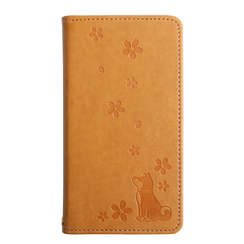 桜の花びらが舞う中で、お花見しながら散歩しているワンコをデザインしたキュートなスマホケース。可愛い柴犬デザイン♪