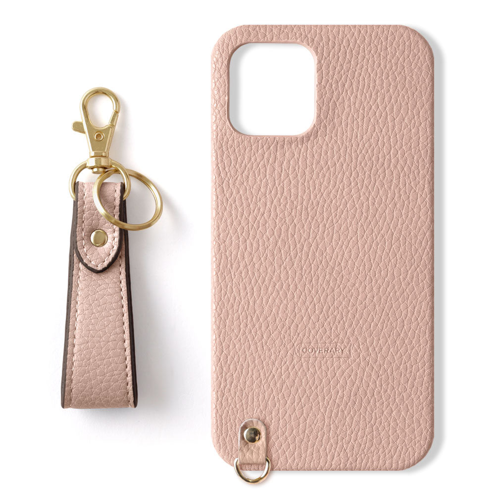 淡くスモーキーな色合いと淵のダークブラウンのトレンド感溢れるカラーリング。高級感のあるシボ加工のレザー調スマホケースとフィンガーストラップのセット。