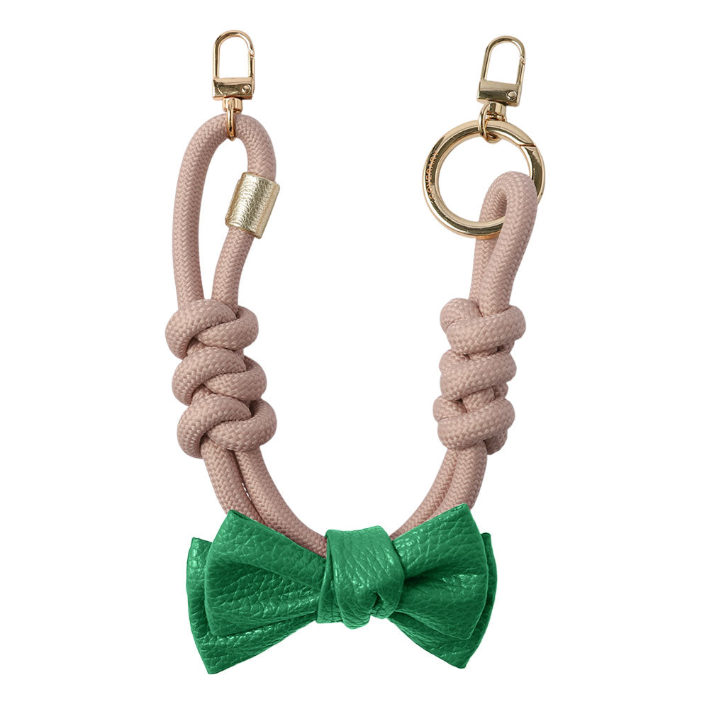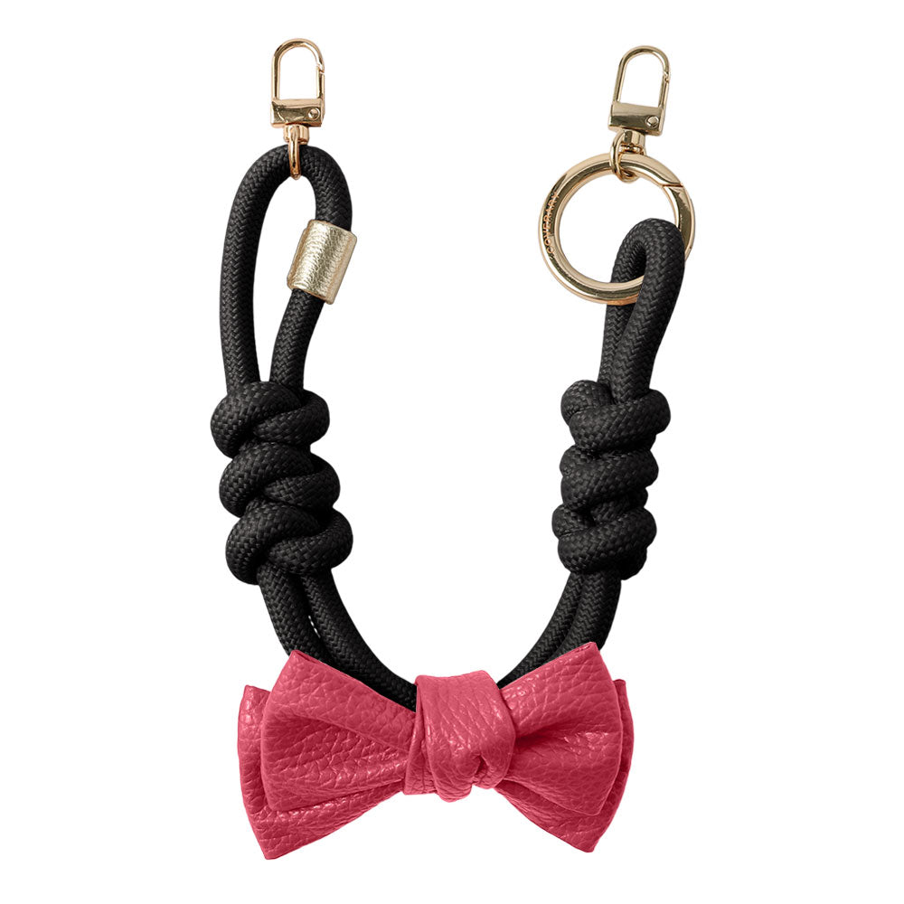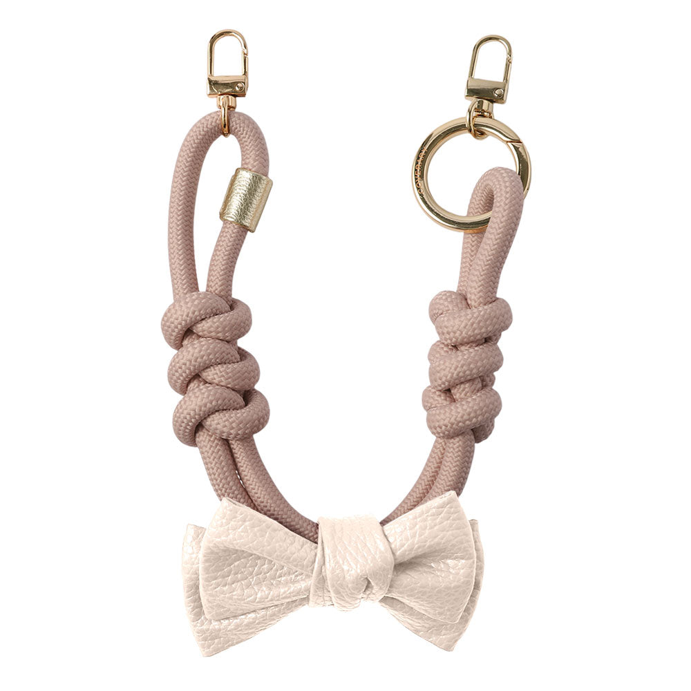 A hand strap woven with paracord adorned with a leather ribbon. Not only durable and easy to use, but the subtle ribbon adds a touch of cuteness. Attach it to your smartphone case or bag to add an accent to your daily coordination.