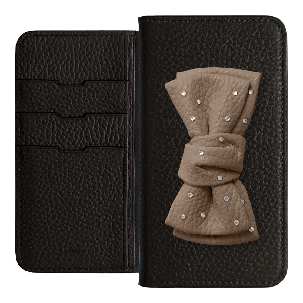 A smartphone case with a cute double ribbon made from the same Italian leather as the case! The large double ribbon instantly brightens up simple outfits♪ The ribbon is adorned with sparkling stones, adding elegance and glamour.