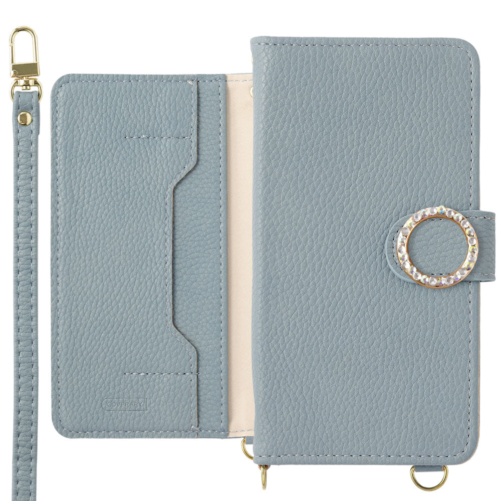 High-quality PU leather smartphone case with shoulder strap in notebook style. The inside of the notebook case has storage pockets where you can put IC cards, point cards, etc. Round deco with sparkling stones attached♪