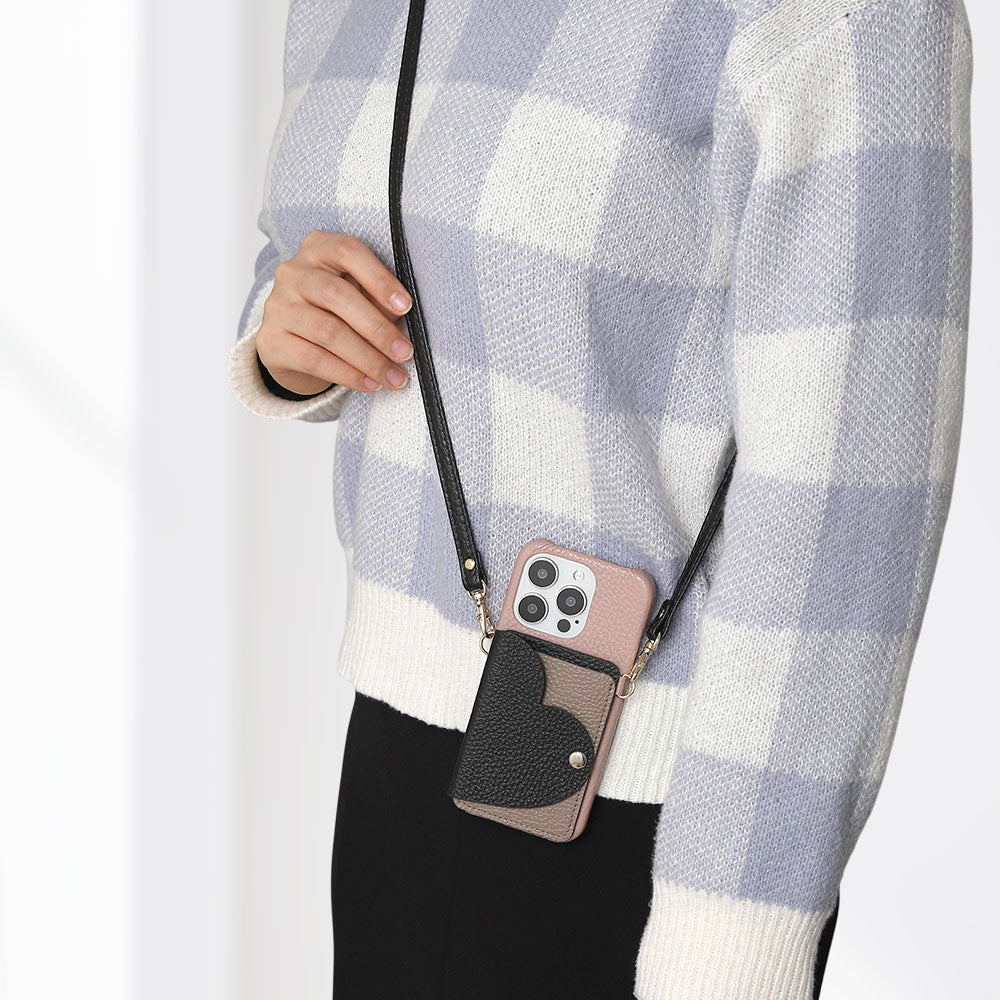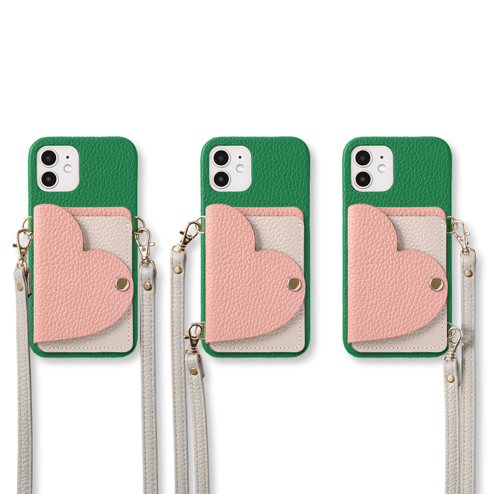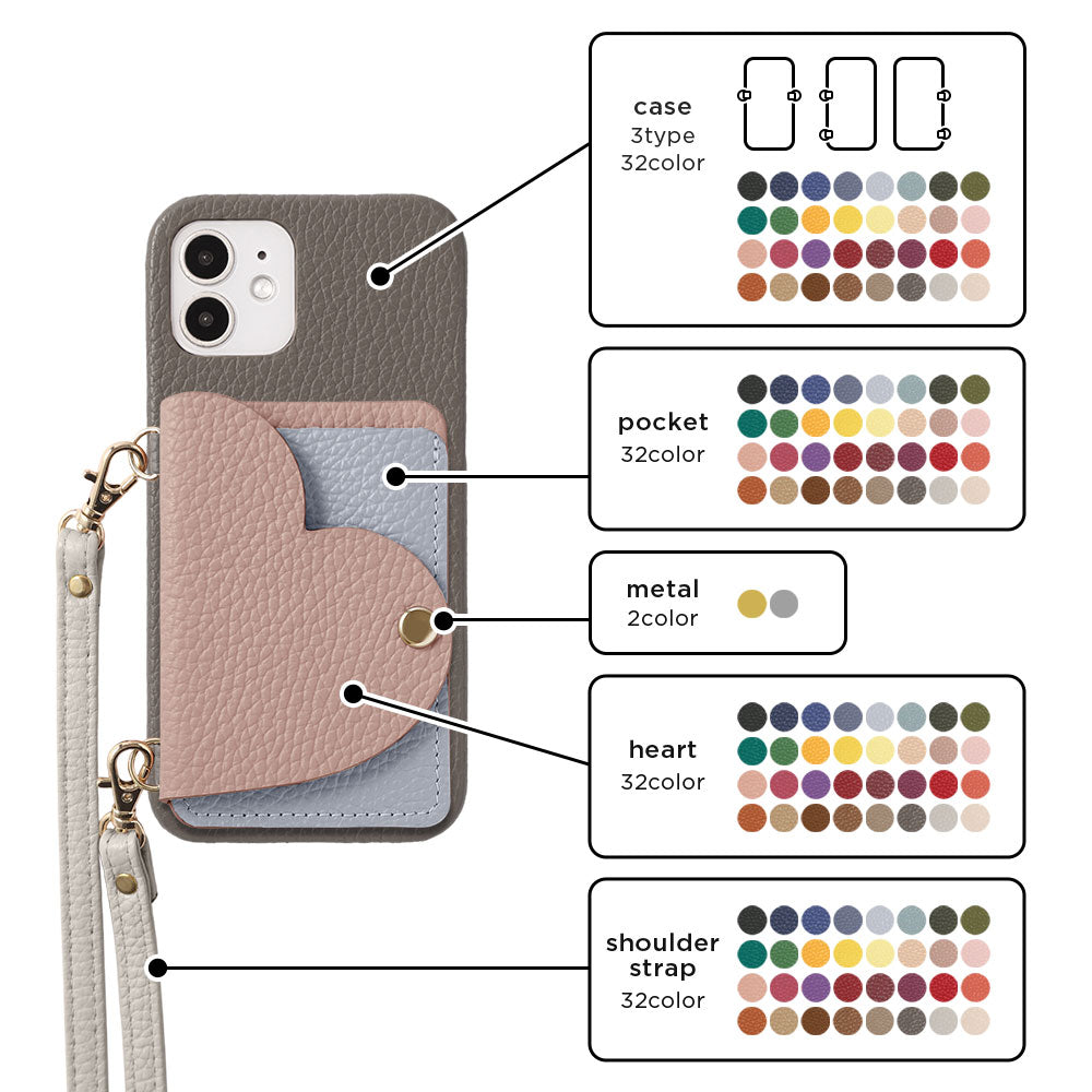 The smartphone case and shoulder strap come in 32 colors, and for the card case, you can choose the colors of the heart part and the pocket part respectively, allowing you to create a bicolor or matching color combination to your liking.