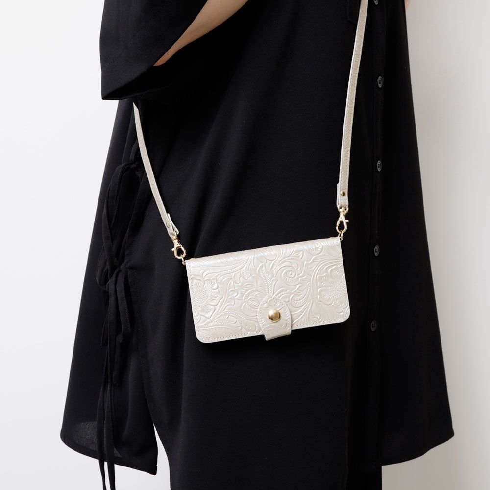 ■上質な本革の全面にアンティークフラワー柄エンボスを施した、大人の気品漂う手帳型スマホケースです。