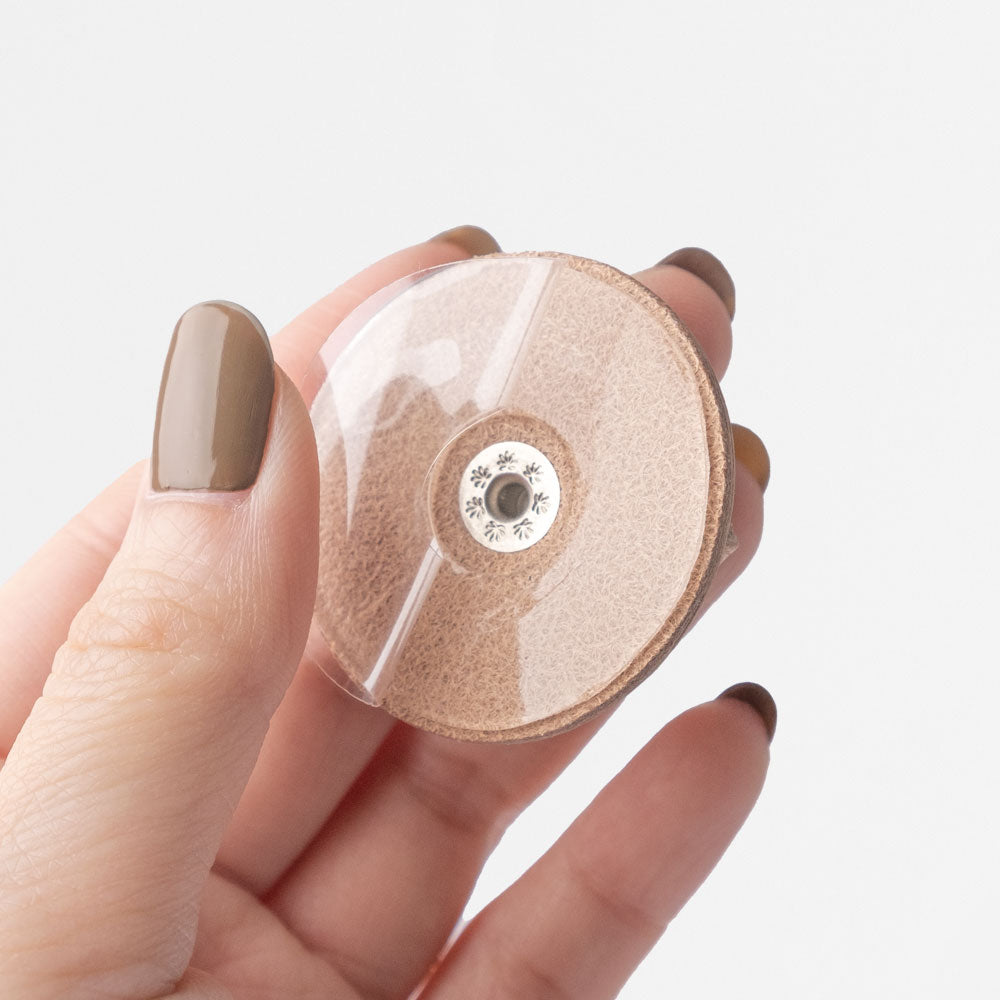 ポリカーボネート素材のケースと薄く加工した本革を貼り合わせ。裁断から淵塗り、仕上げの刻印まで手仕事で作られています。