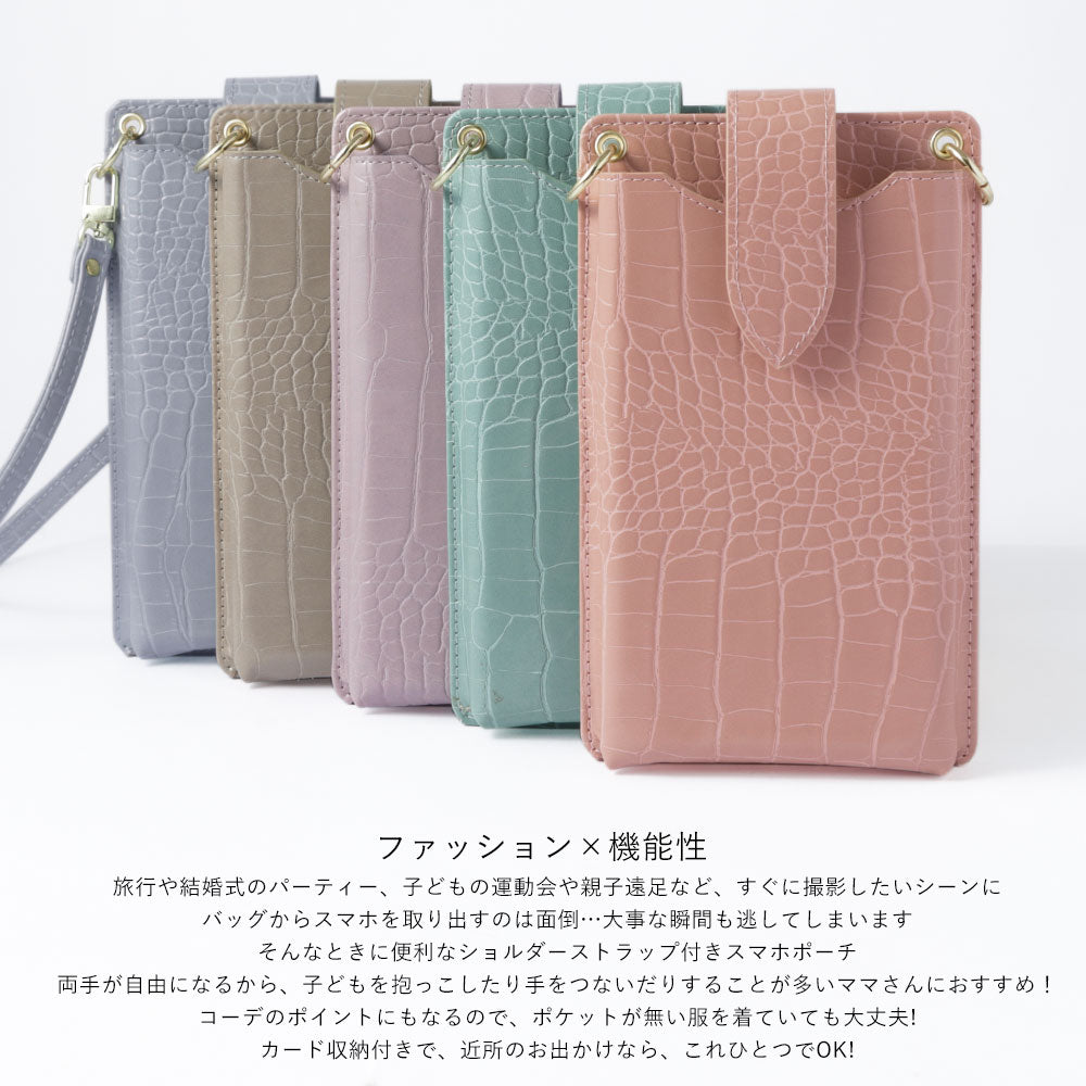スマートフォンを楽々収納♪使いたいときにサッと取り出せてポケット感覚で使用できるスマホポーチです。高級感があるクロコダイル調のシンプルなデザインなので、どんなスタイルにも合わせやすくておすすめです。_スマートフォン以外にもハンカチやエコバッグ等を入れるのに使用したり、使い方は自由自在! くすみ感のあるパステルな色合い5色のカラーバリエーションからお選びいただけます。
