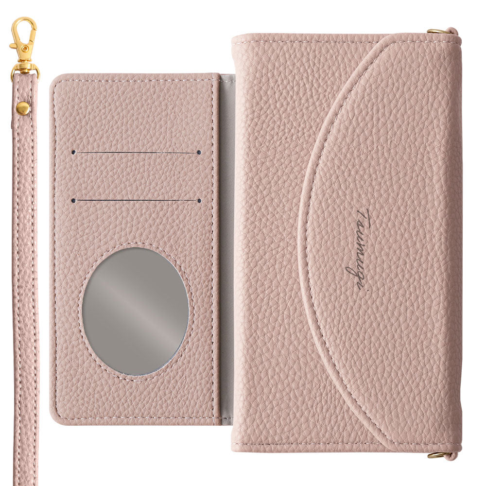 お出かけに便利なショルダーストラップ付きスマホケース。トレンド感溢れるスモーキーな全5色からお選びいただけます。身だしなみチェックができるカードミラー付き。