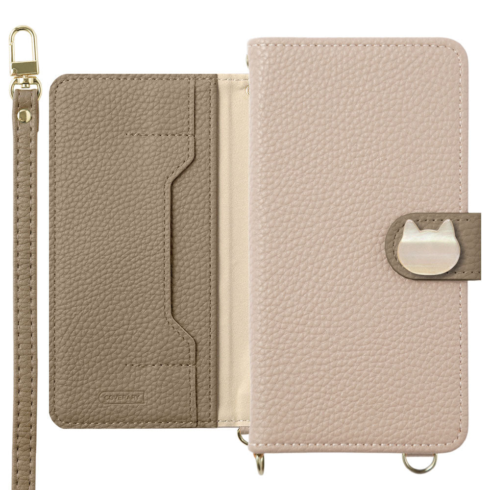 上質なPUレザーのショルダーストラップ付き手帳型スマホケース。手帳ケースの内側には収納ポケットがあり、ICカードやポイントカードなどを入れることができます。ベルト部分に可愛いネコのワンポイント6色♪