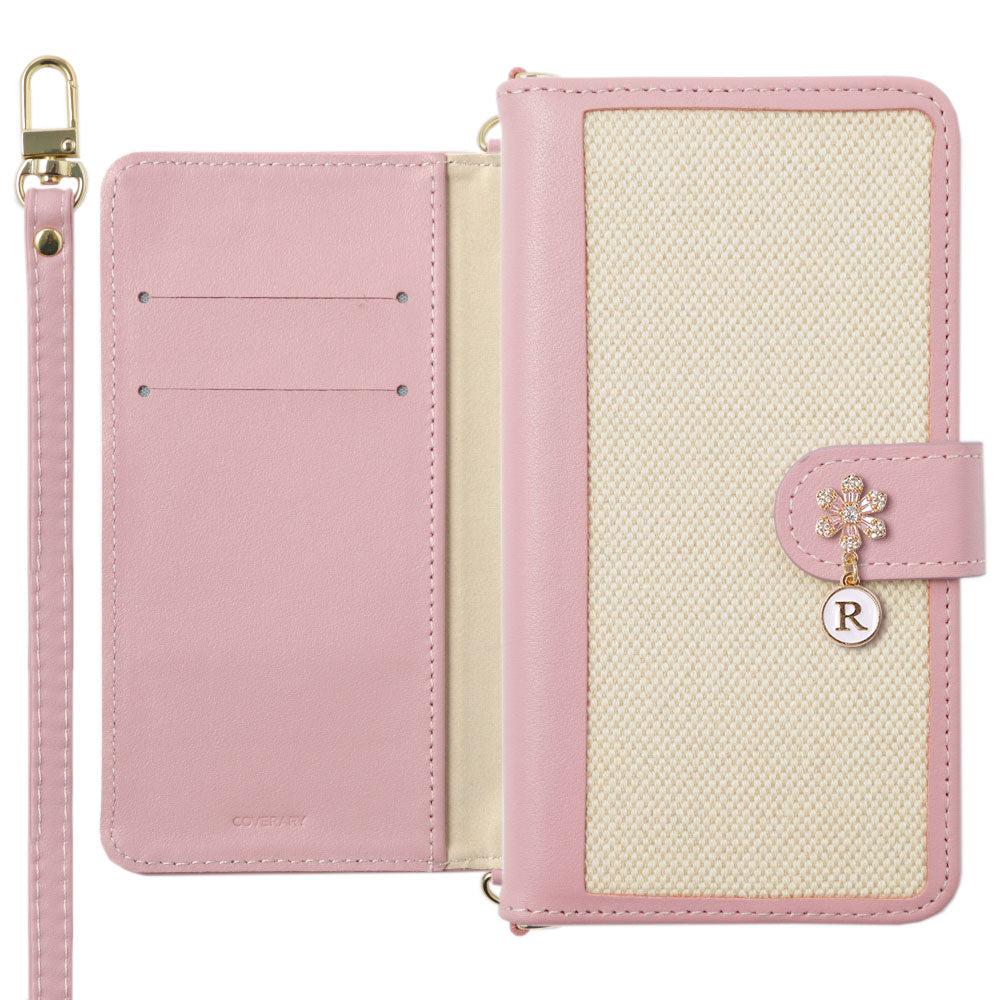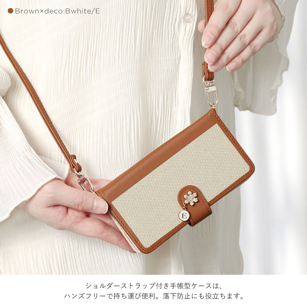 本革 レザー×キャンバス異素材MIX スタンド機能 ショルダーストラップ付き フラワーイニシャルチャーム 手帳型ケース(ベルトあり)Galaxyシリーズ