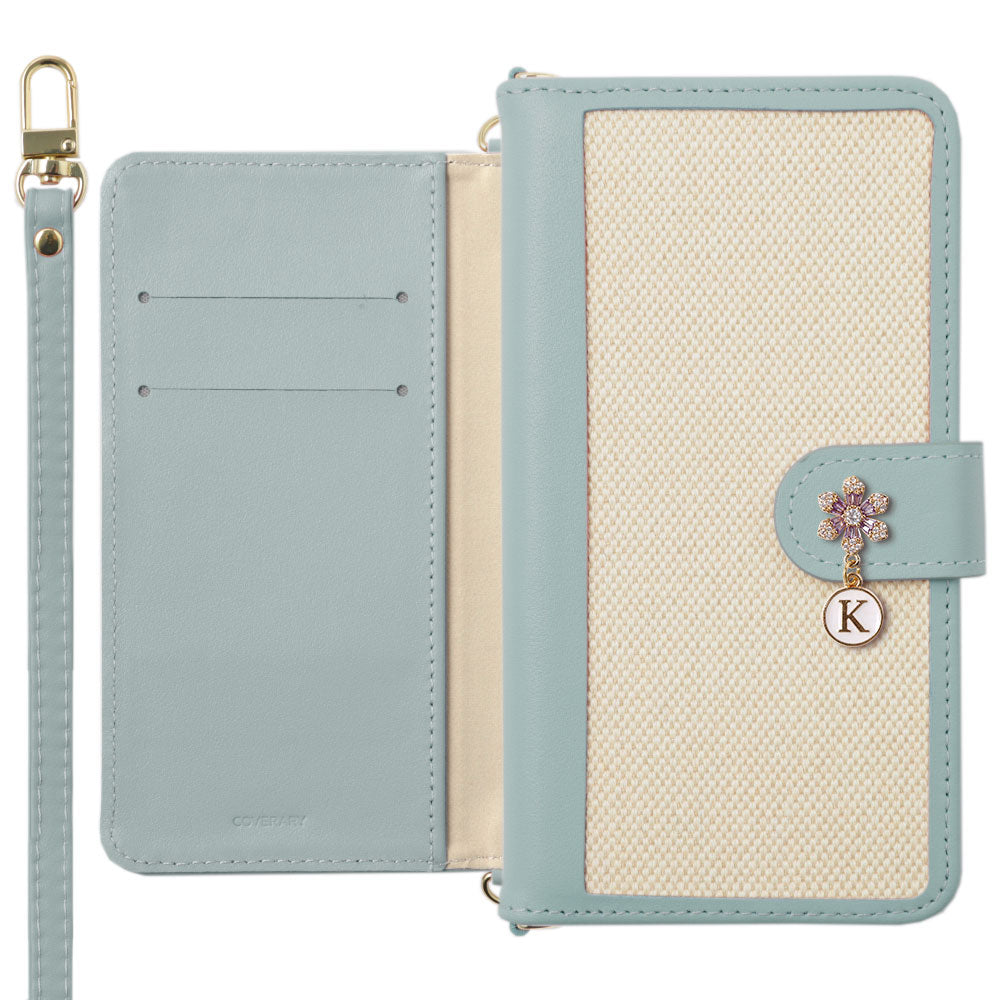 本革 レザー×キャンバス異素材MIX スタンド機能 ショルダーストラップ付き フラワーイニシャルチャーム 手帳型ケース(ベルトあり)iPhoneシリーズ