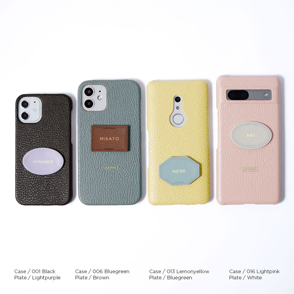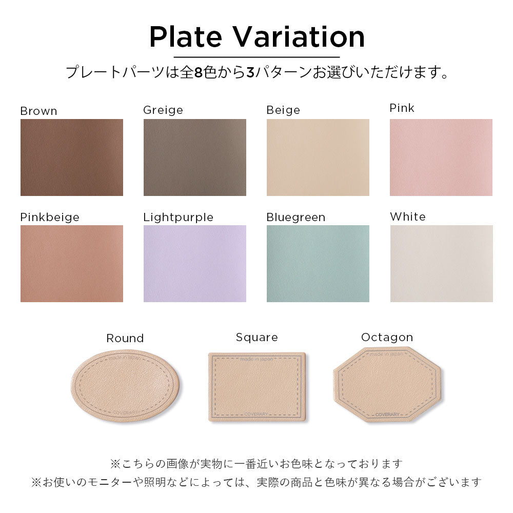 プレートは3つのデザイン × 8色から選択可能。お好きなイニシャルやお名前を刻印できるので、ギフトにもぴったり!プレートの裏面には接着部分があり、お好みの位置に貼付してお使いいただけます。