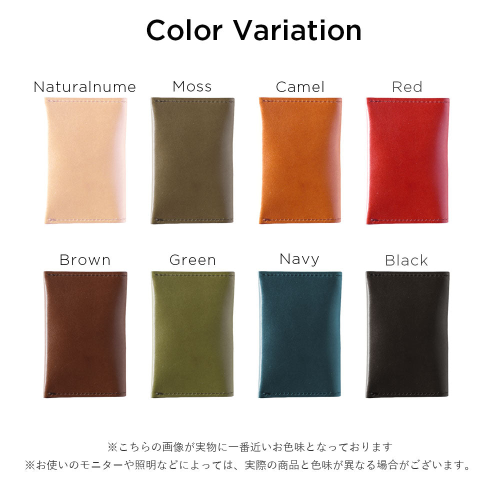 ポリカーボネート素材のケースと薄く加工した本革を貼り合わせ。裁断から淵塗り、仕上げの刻印まで手仕事で作られています。