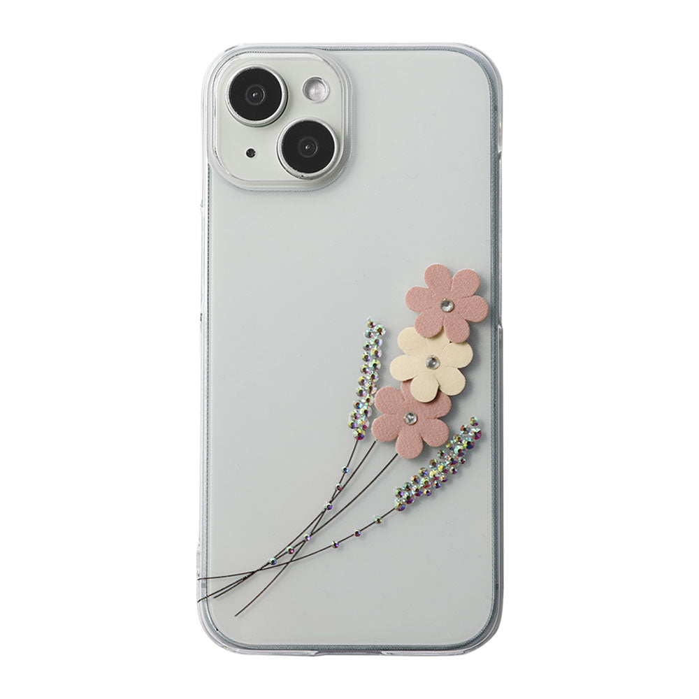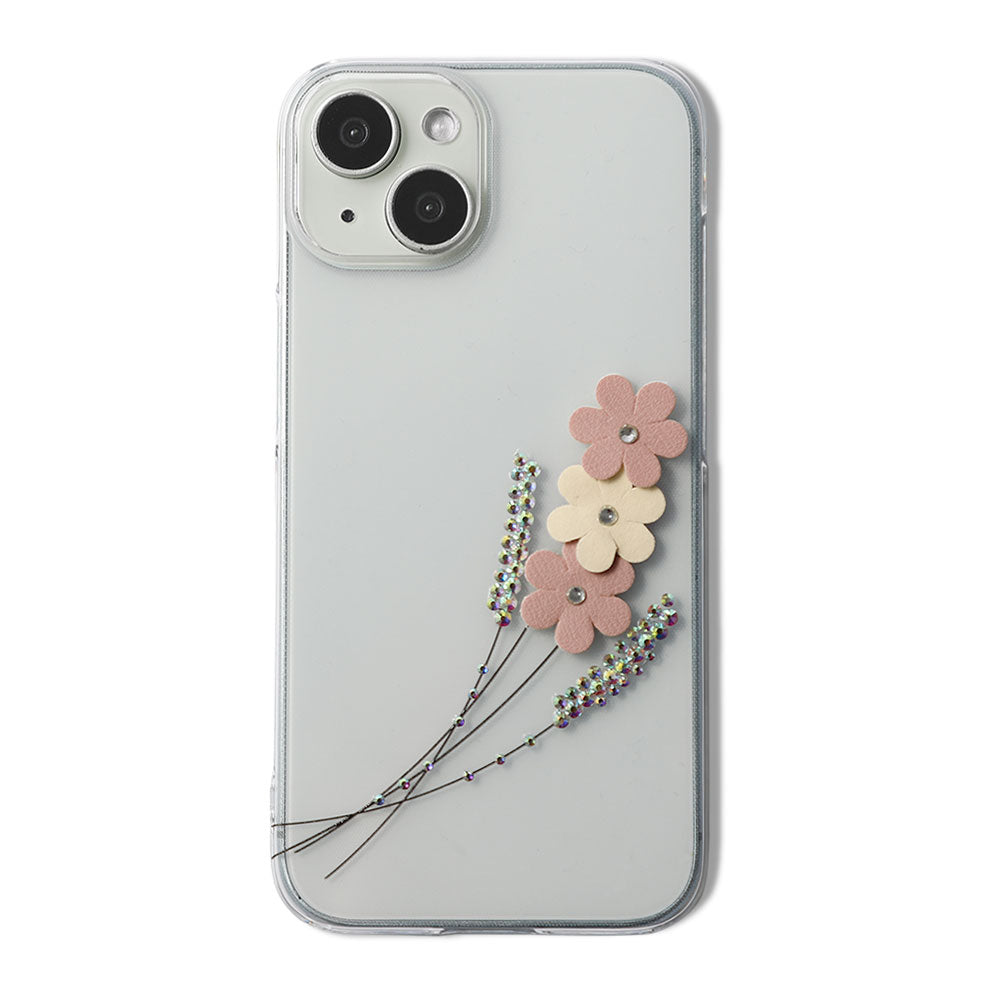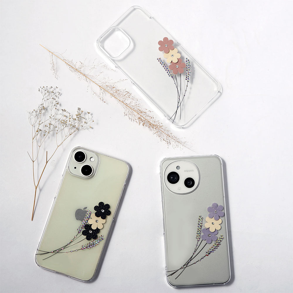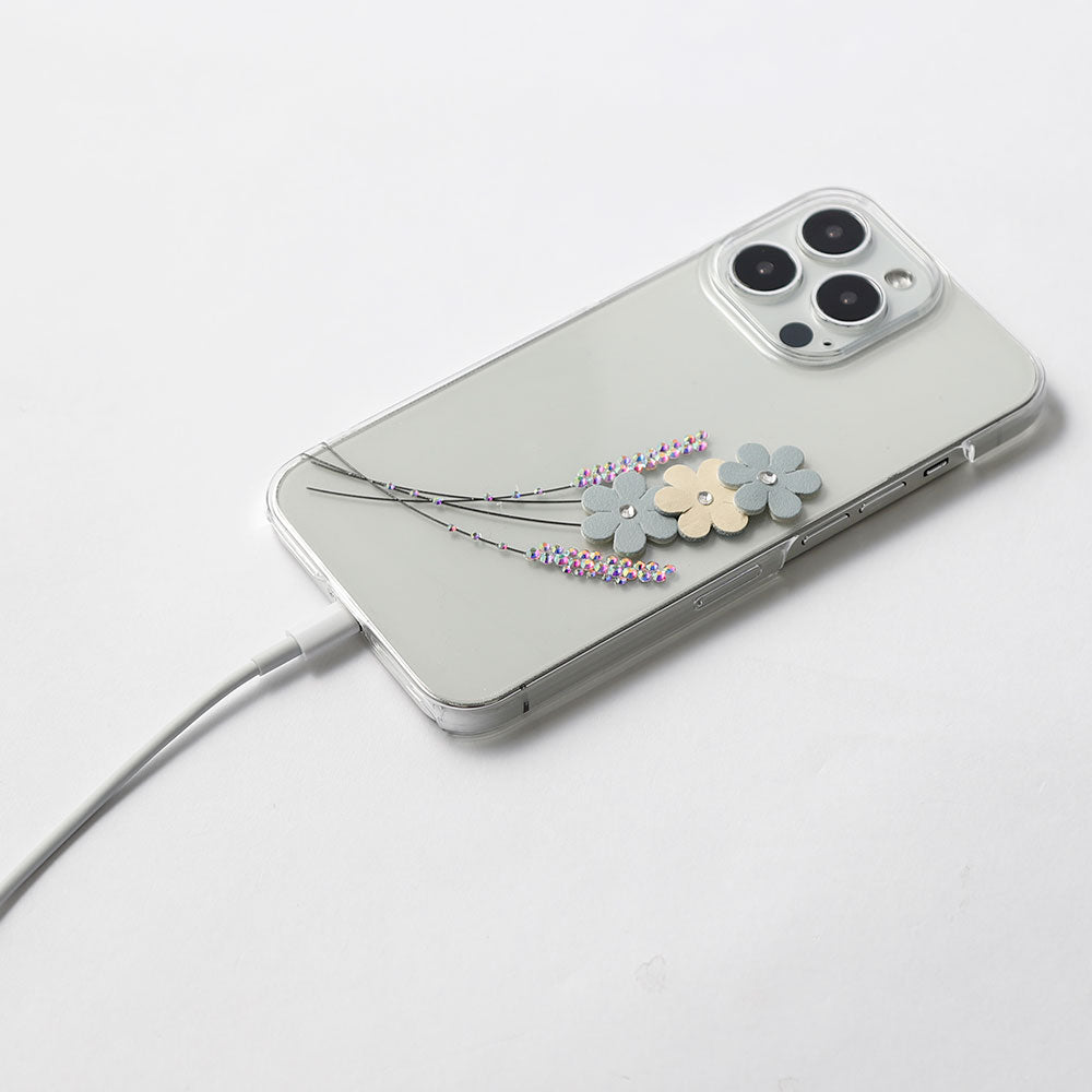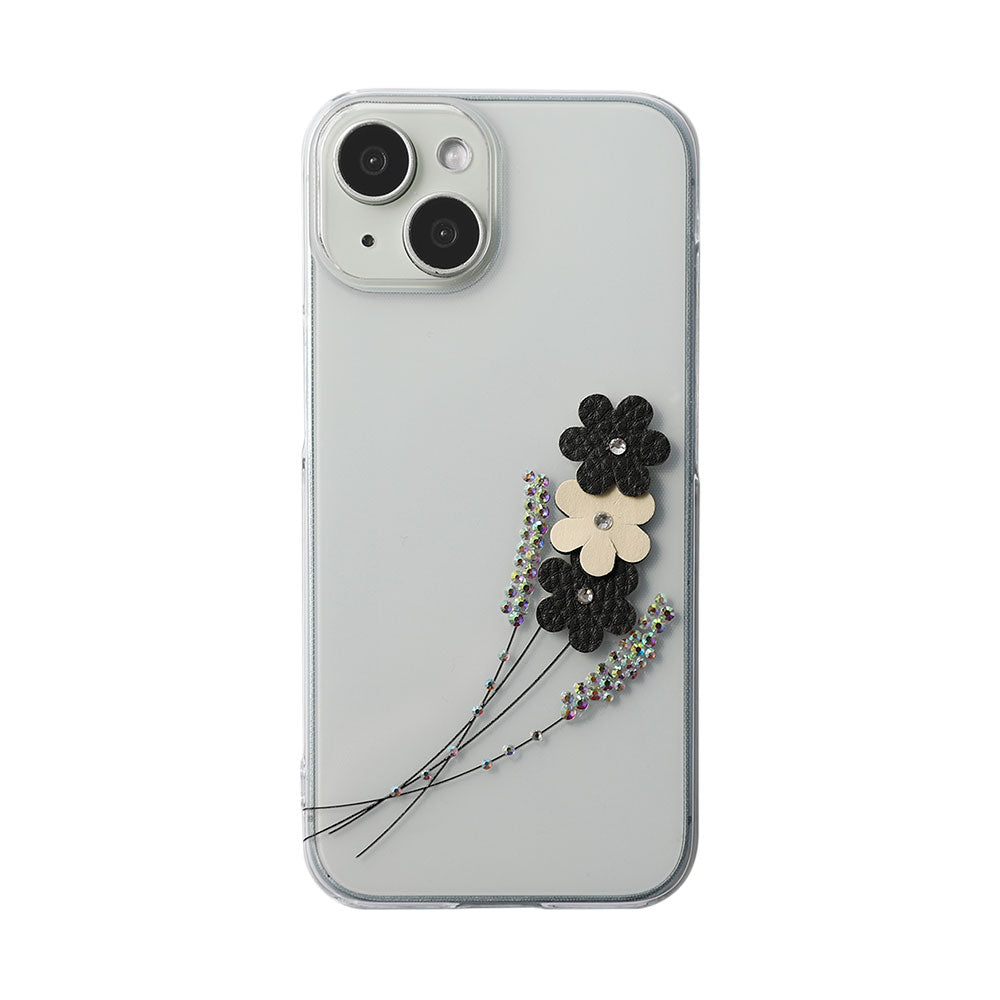 クリアケースにレーザー加工とストーンを施し、ヴィーガンレザーを使用したフラワーモチーフをあしらいました。繊細さと華やかさを兼ね備えた、大人可愛いデザインに仕上げています。