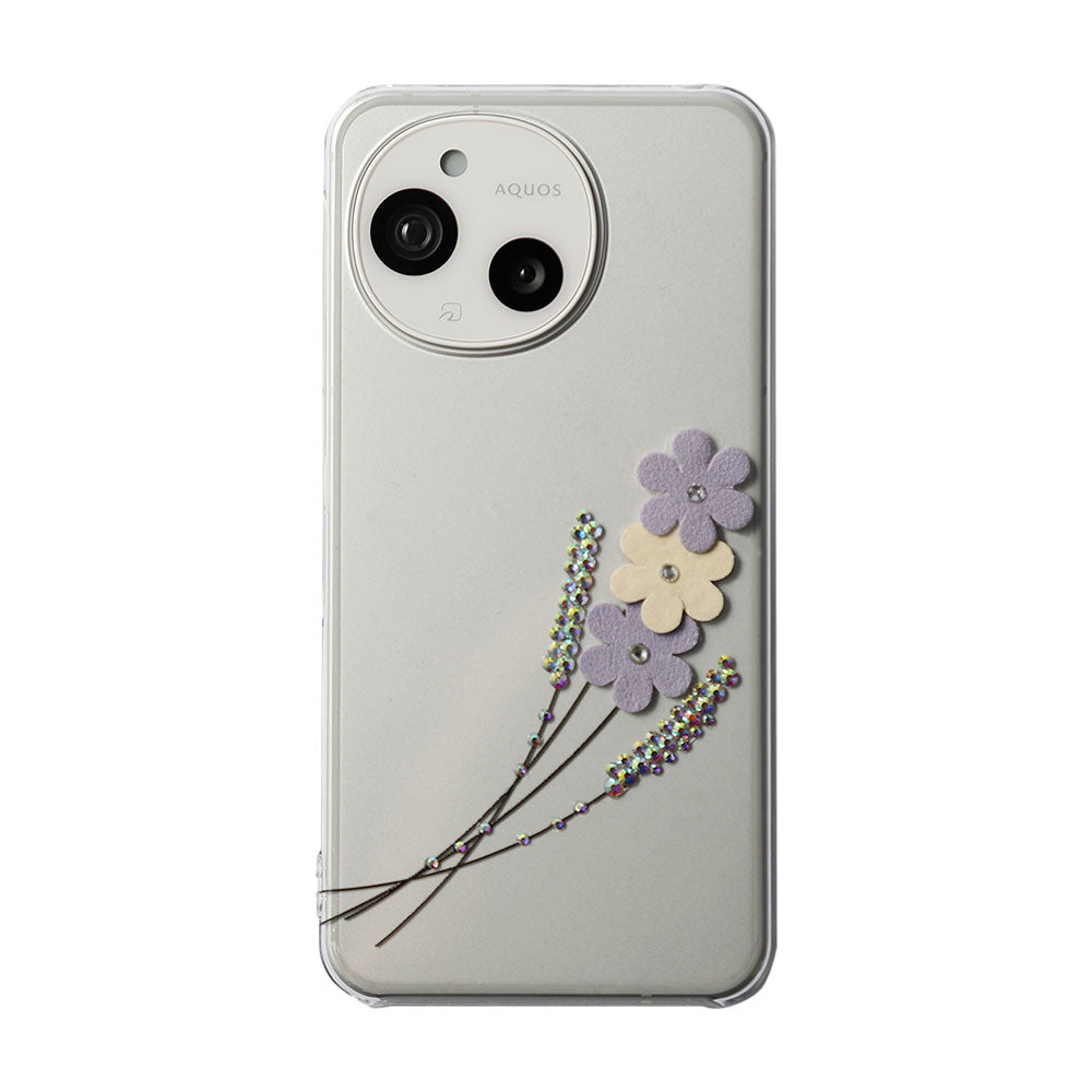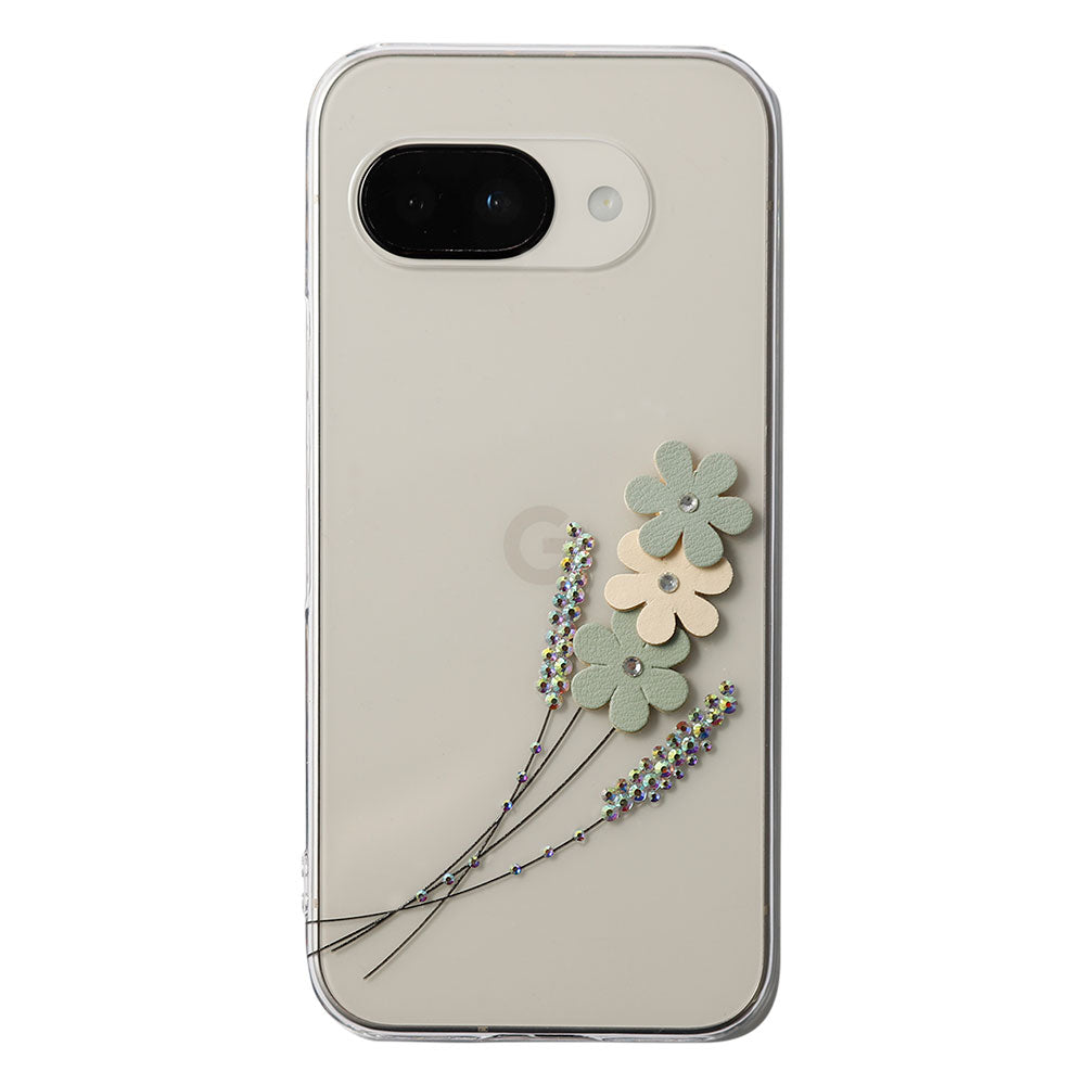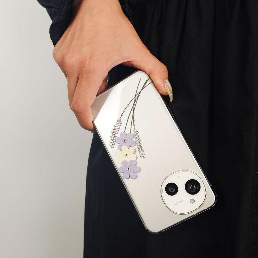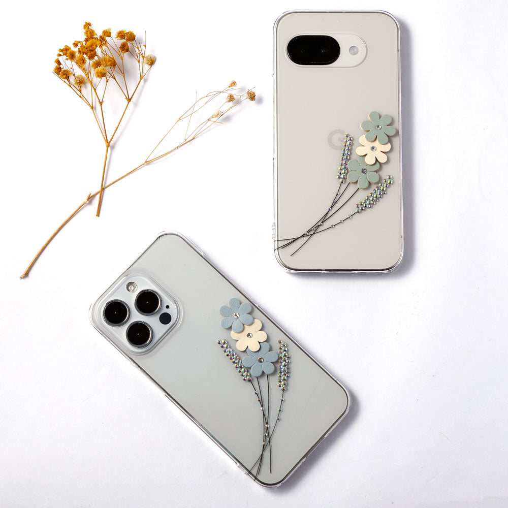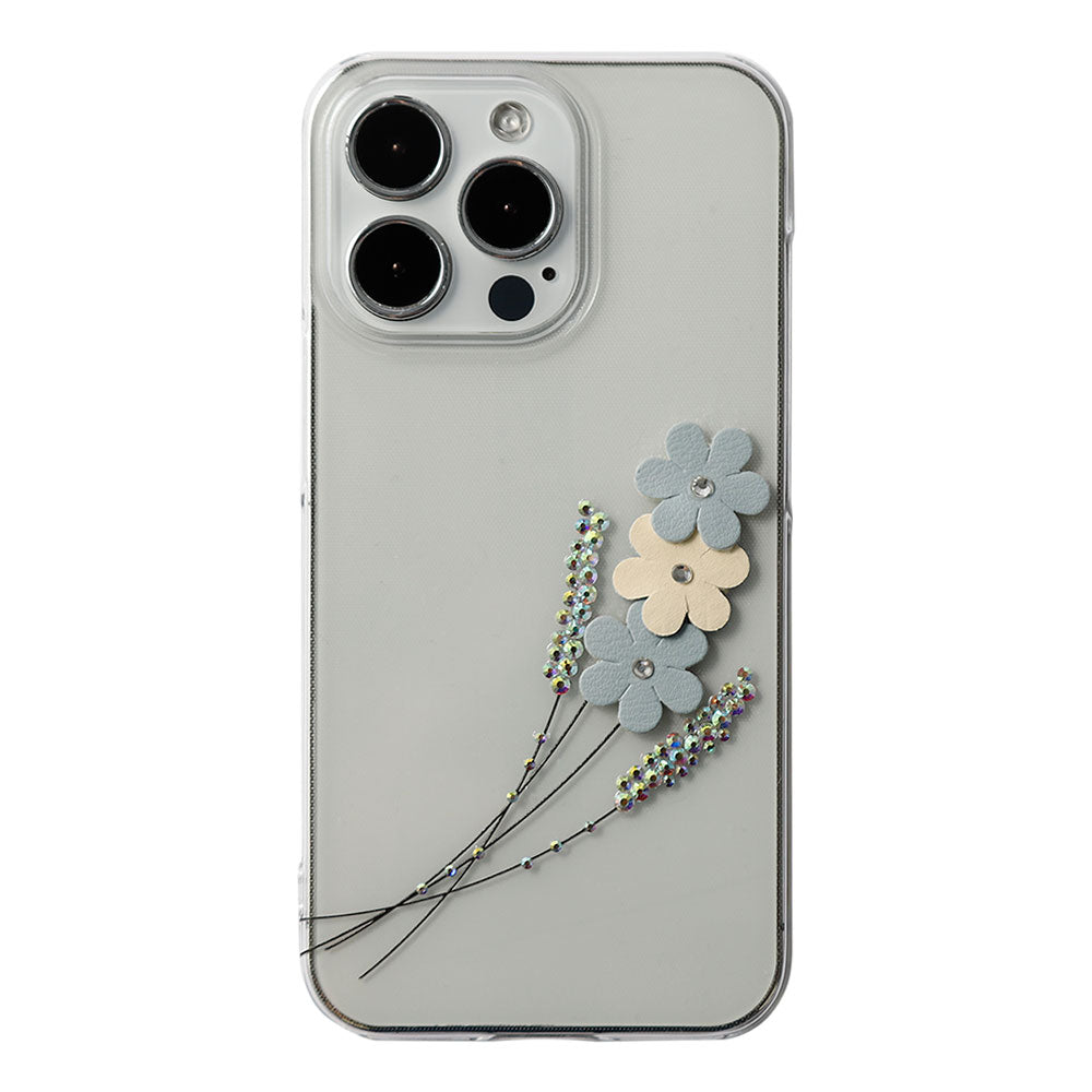 クリアケースにレーザー加工とストーンを施し、ヴィーガンレザーを使用したフラワーモチーフをあしらいました。繊細さと華やかさを兼ね備えた、大人可愛いデザインに仕上げています。