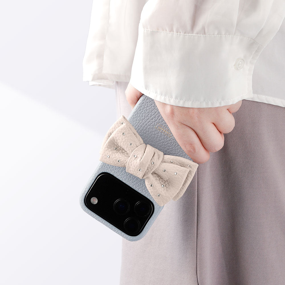 ケースと同じイタリアンレザーを使用した可愛いダブルリボンが付いたスマホケース!大きなダブルリボンがシンプルなコーデもパッと華やかに♪リボンにはキラキラと輝くストーンをあしらい、上品さと華やかさをプラスしました。
